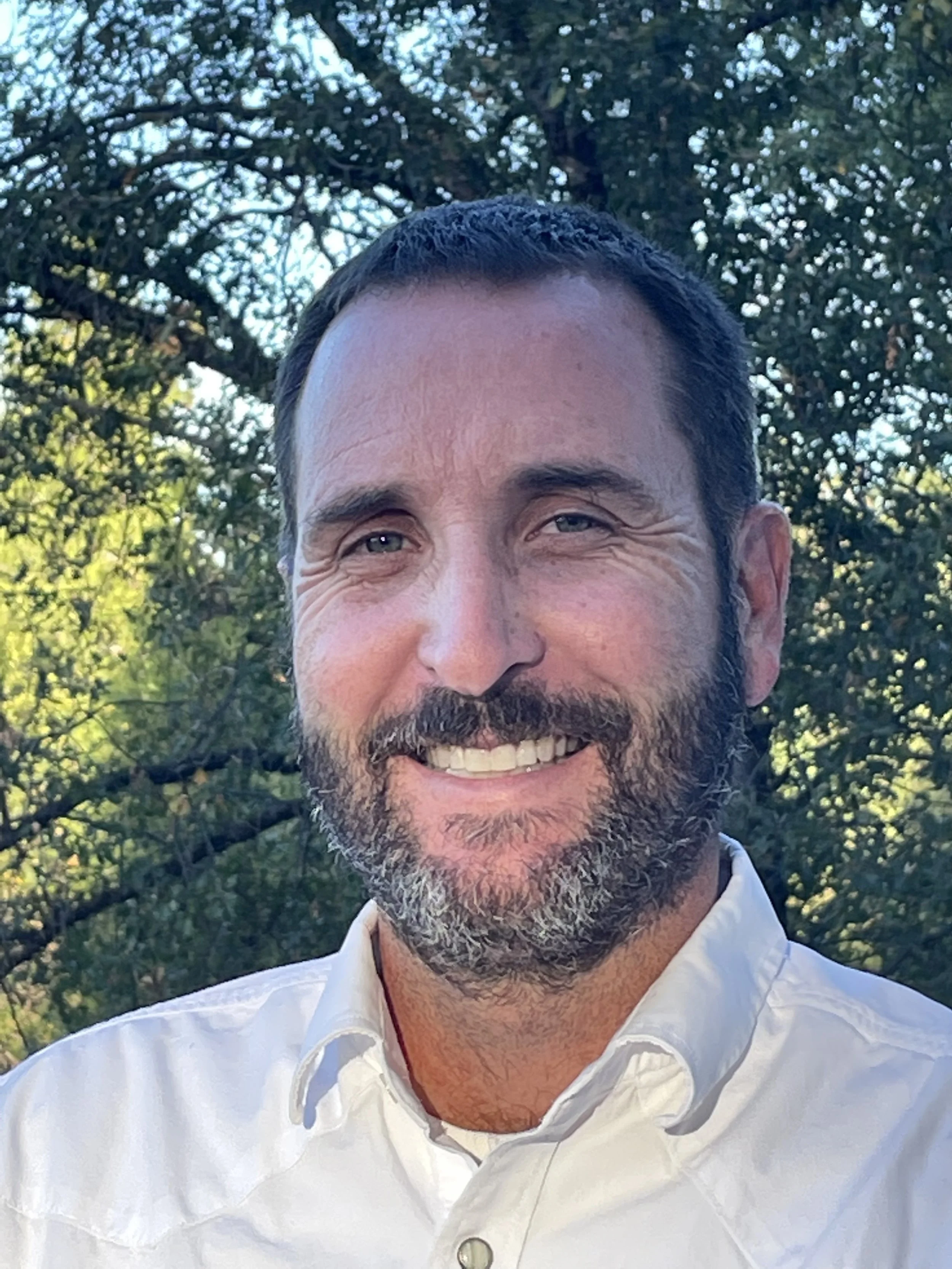 Josh Lepore with a beard and short dark hair, wearing a white button-up shirt, standing outdoors with green trees in the background.